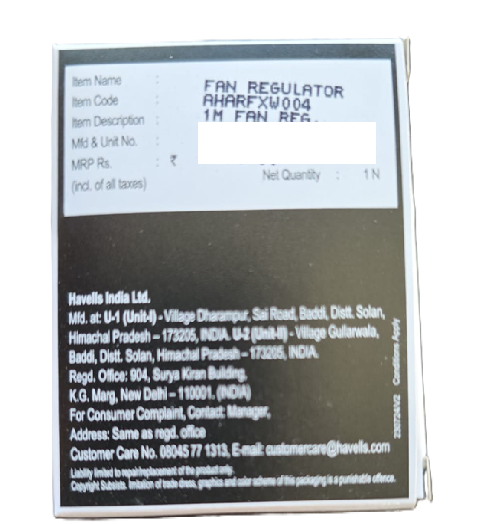 Havells Fan Regulator (Adiva Series) in White is a compact and stylish fan speed controller for modular switch plates. It offers smooth speed control and is ideal for homes, offices, and commercial spaces.
