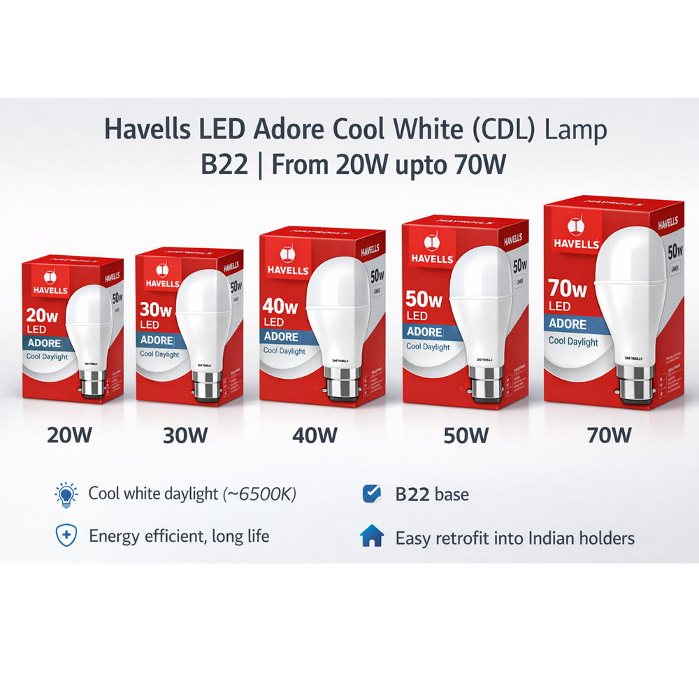 The Havells Adore Cool White (CDL) LED lamp is a high-performance lighting solution engineered to deliver bright, daylight-like illumination while consuming significantly less energy than traditional incandescent or CFL bulbs. Available in multiple wattages from about 20 W up to 70 W, these LED lamps are suitable for a wide range of residential and commercial lighting applications.