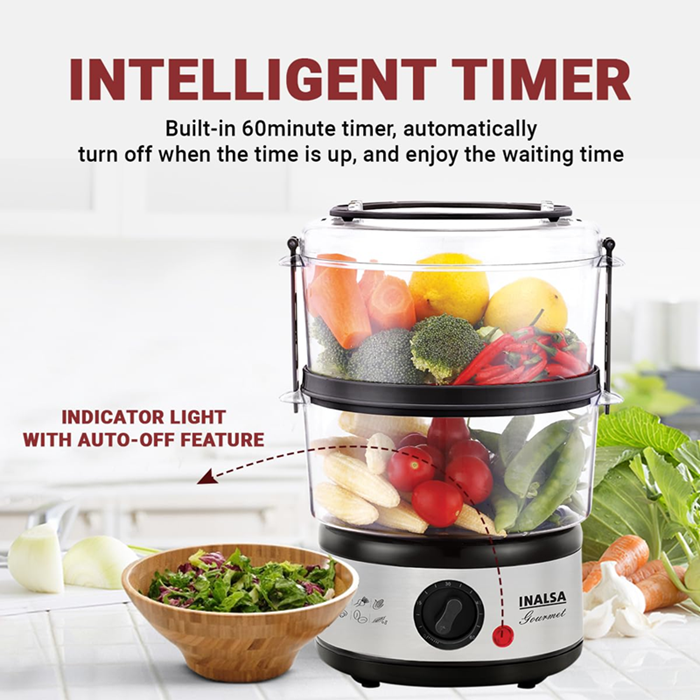Inalsa 5L Gourmet Multi-Function 500W-Food Steamer & Egg Boiler with LED Indicator,BPA-Free 2 Tier Stackable Baskets,Stainless Steel Base,Fits 14 Eggs in One Go (Black/Silver)