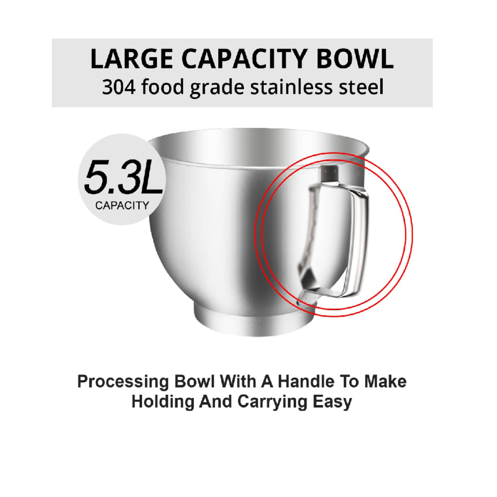 Large Capacity Bowl: 5.3 L stainless steel bowl is perfect for family-sized batches.