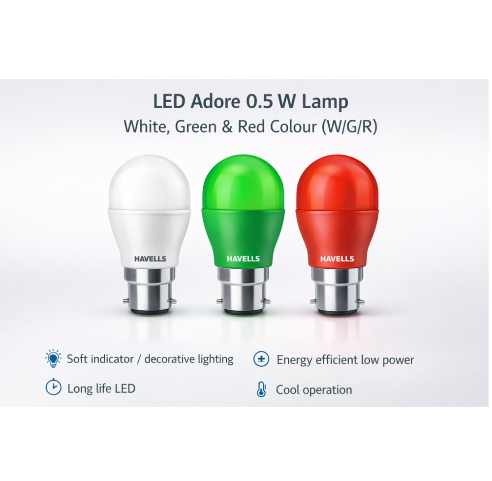 The Havells LED Adore 0.5 W lamp is a compact and energy-efficient lighting solution designed for indicator and decorative purposes. Available in three vibrant colours – White, Green and Red, this lamp provides a soft yet clear illumination suitable for multiple applications such as night lamps, panel indicators, switch boards, temples, decorative fixtures and sign boards.