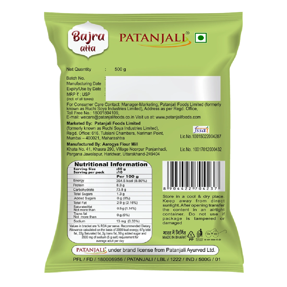 It is commonly used to prepare delicious bajra rotis, bhakri, parathas, and traditional Indian dishes, especially during winter season. Patanjali Bajra Atta supports a balanced diet and can be enjoyed by the whole family.