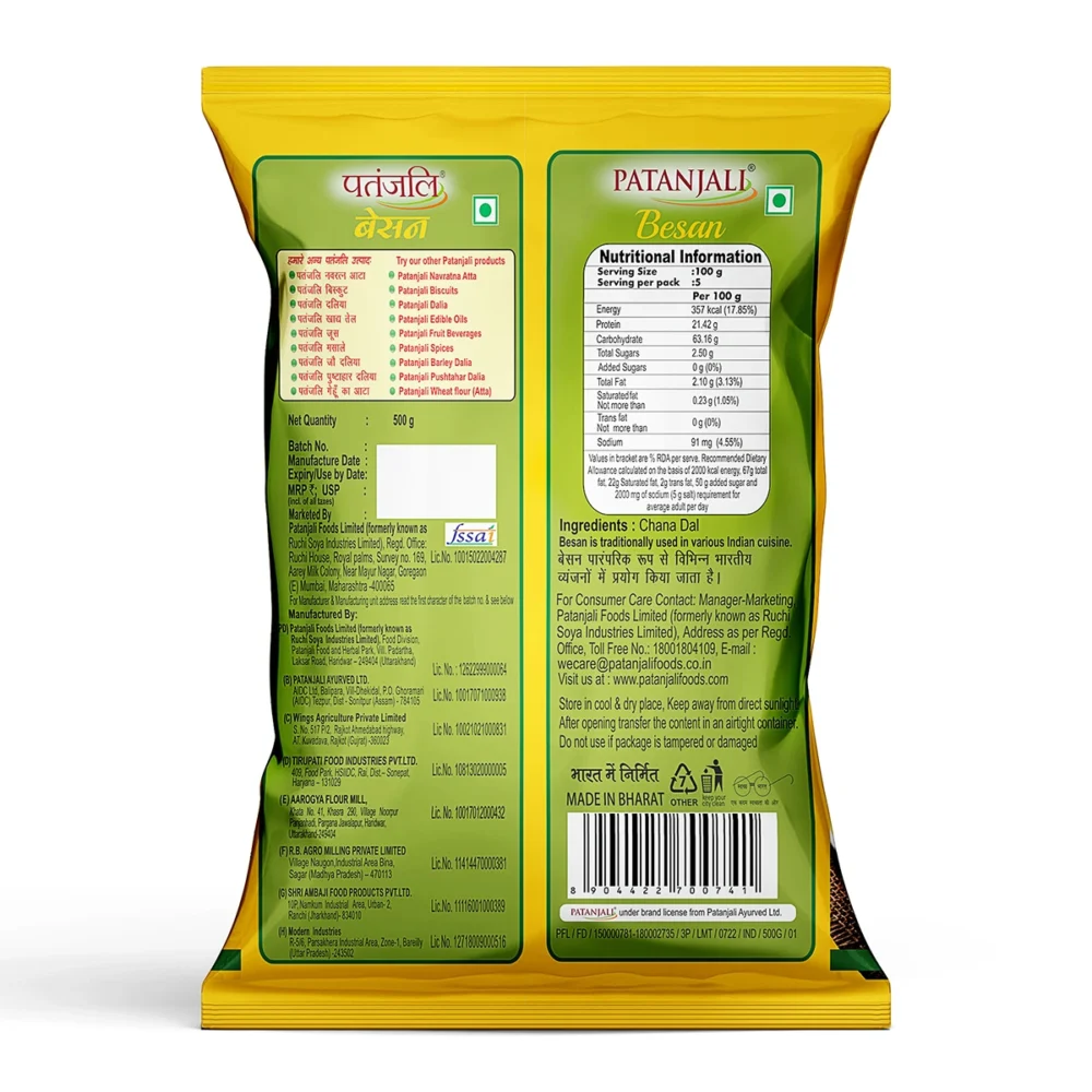 This Patanjali Besan is prepared from high‑quality grams that undergo rigorous testing to meet Patanjali’s specifications. It’s processed to be free of insects, damaged grains and dust. Fresh Mart Solution+3Patanjali Ayurved+3RetailerShakti+3 It is naturally gluten‑free.