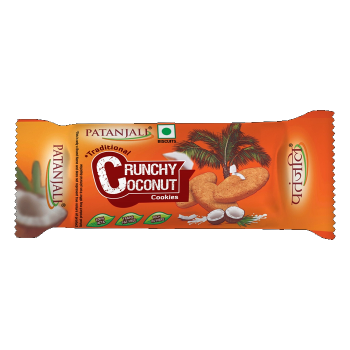 These are crunchy coconut-flavored biscuits made by Patanjali, marketed as a tea-time snack. They’re baked using whole wheat flour with coconut mixed in, intended as a simple, everyday snack.
