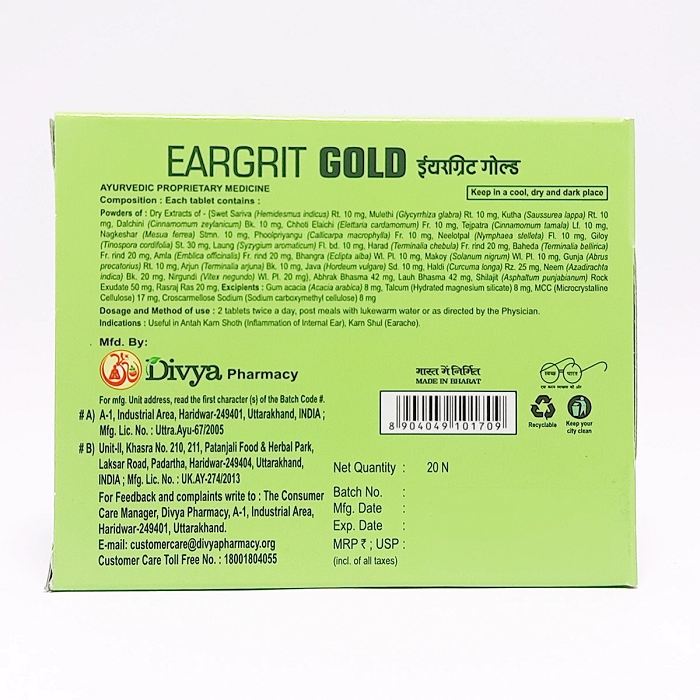 is an Ayurvedic tablet formulation used to help with earache (Kam Shul) and inflammation of the internal ear (Antah Karn Shoth). It contains a blend of traditional herbs and minerals and is available from various online retailers
