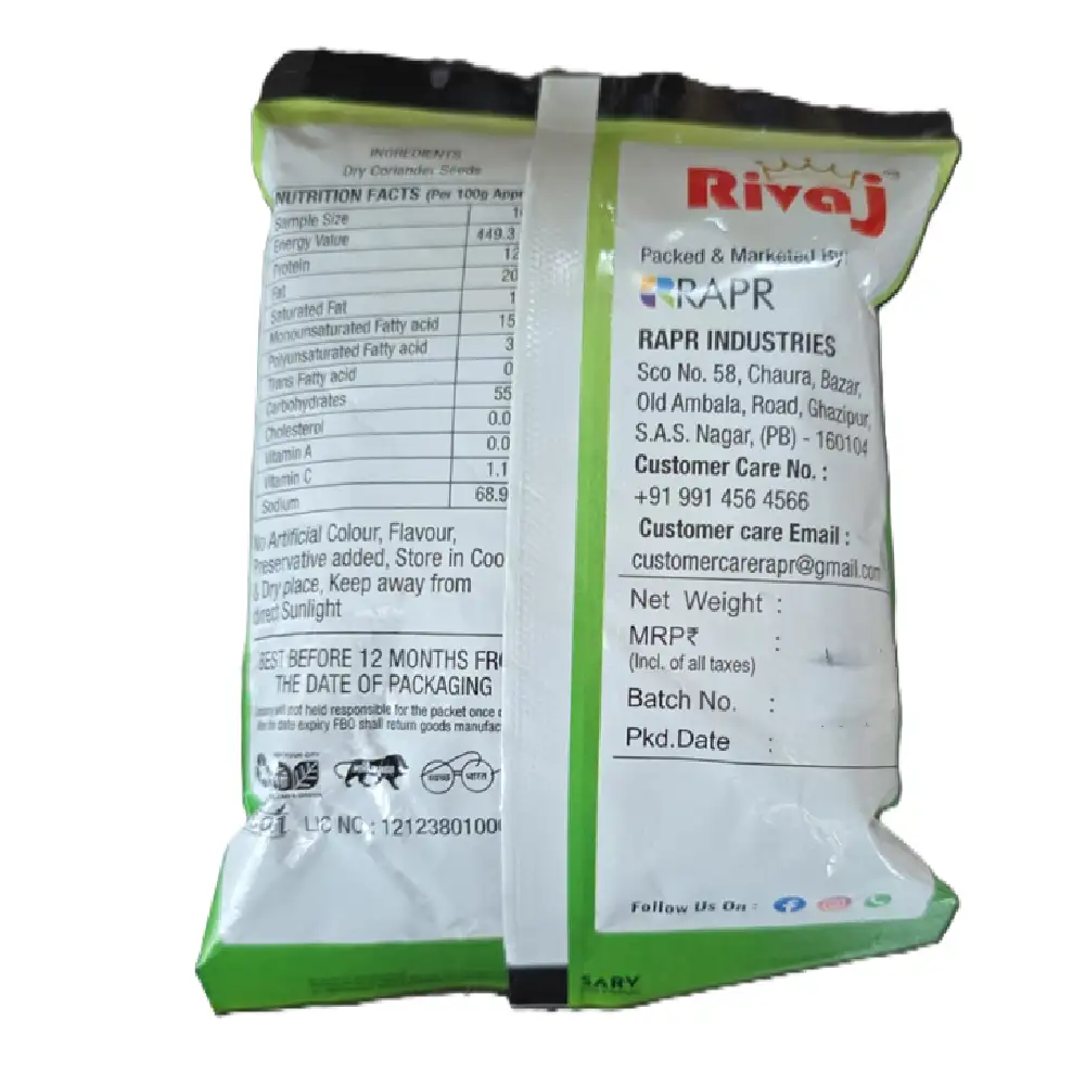 Rivaj Coriander Powder 100g is a pure and natural spice made from high-quality coriander seeds. It enhances the flavor of Indian dishes with its rich aroma and contains no artificial flavours. 100% vegetarian and perfect for everyday cooking.