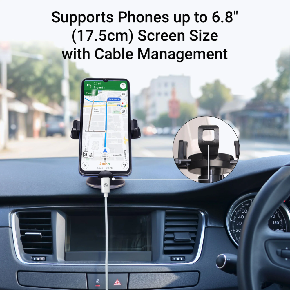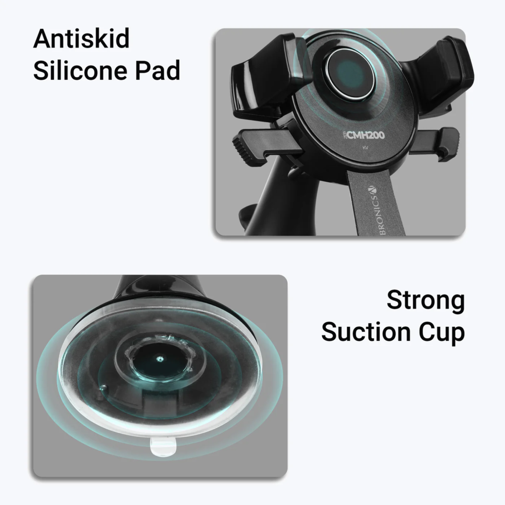 Zebronics CMH200 Car Mobile Holder is a durable and convenient phone mount designed for your car’s windshield, dashboard, or any suitable flat surface. It features a strong suction cup, anti-skid silicone padding, and a 360° rotatable holder for the perfect viewing angle. The holder supports smartphones with screen sizes up to 17.5 cm and includes one-press lock and release for easy operation.