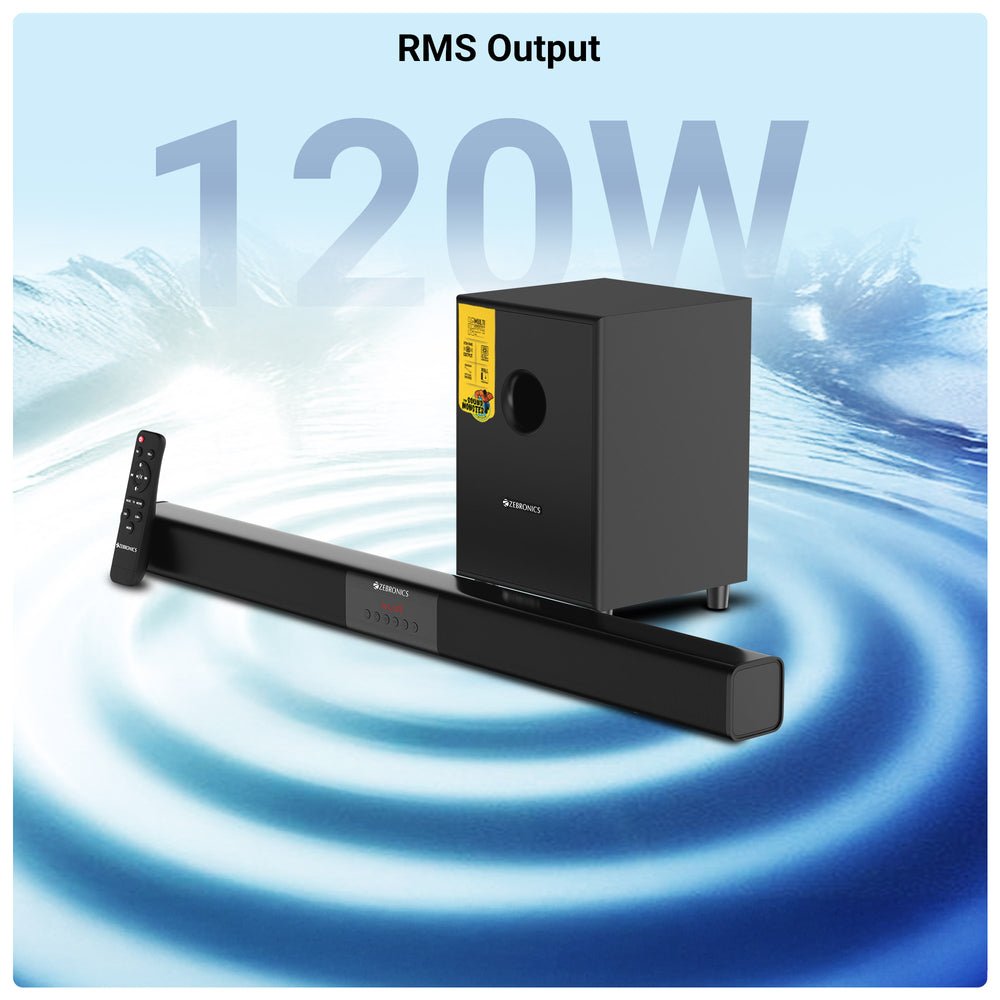 ZEBRONICS SONATA 2 Soundbar delivers powerful 120W output with a dedicated 10.16cm subwoofer for deep bass and immersive sound.