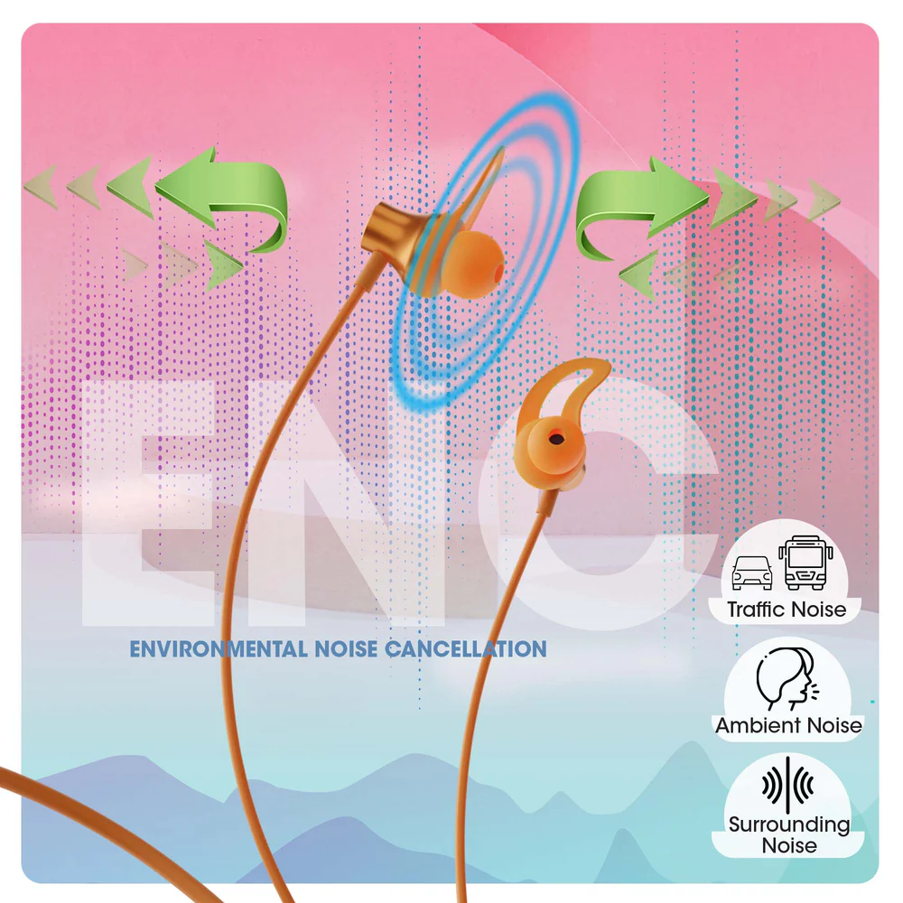 The neckband features 10mm drivers that deliver dynamic sound with deep bass and clear vocals. It also includes Environmental Noise Cancellation (ENC) technology to reduce background noise during calls for better voice clarity.