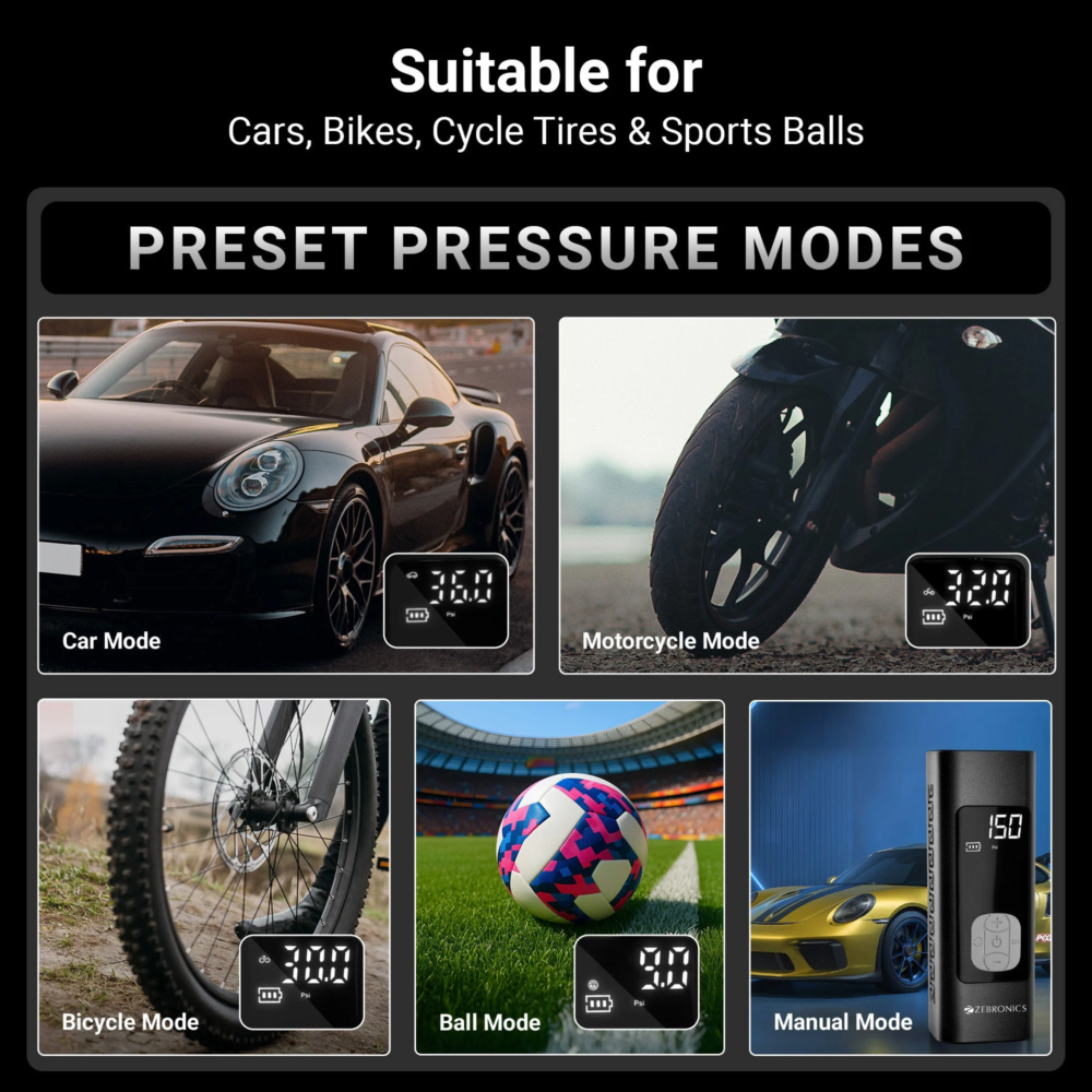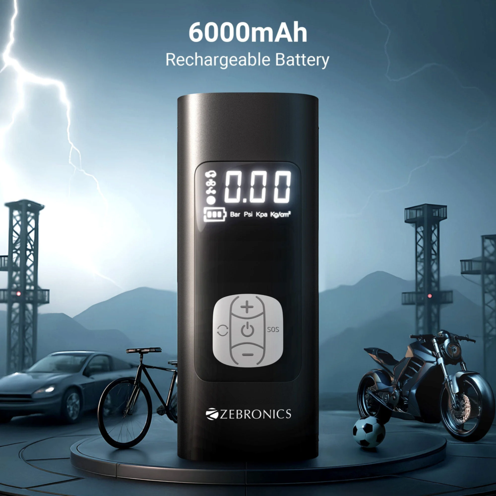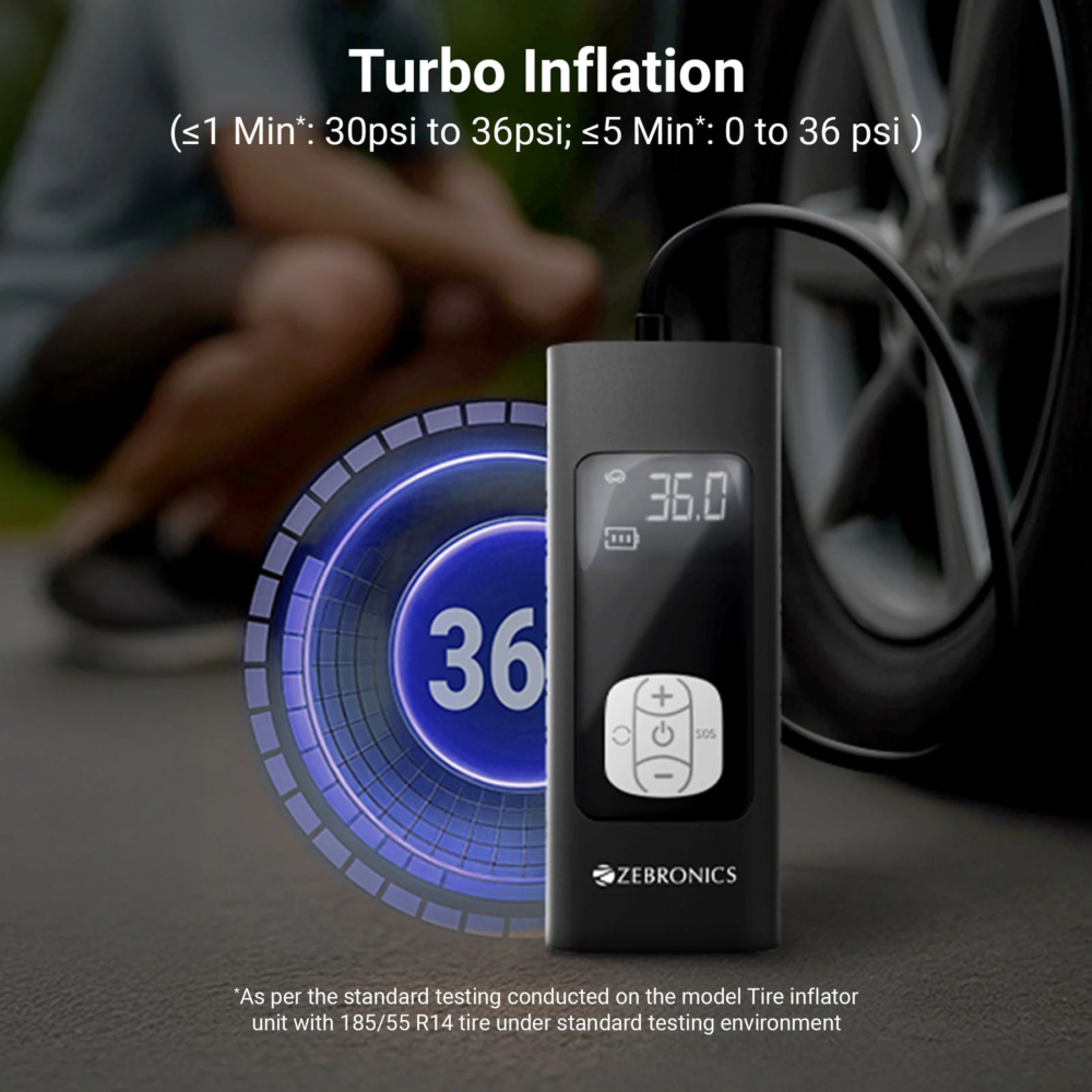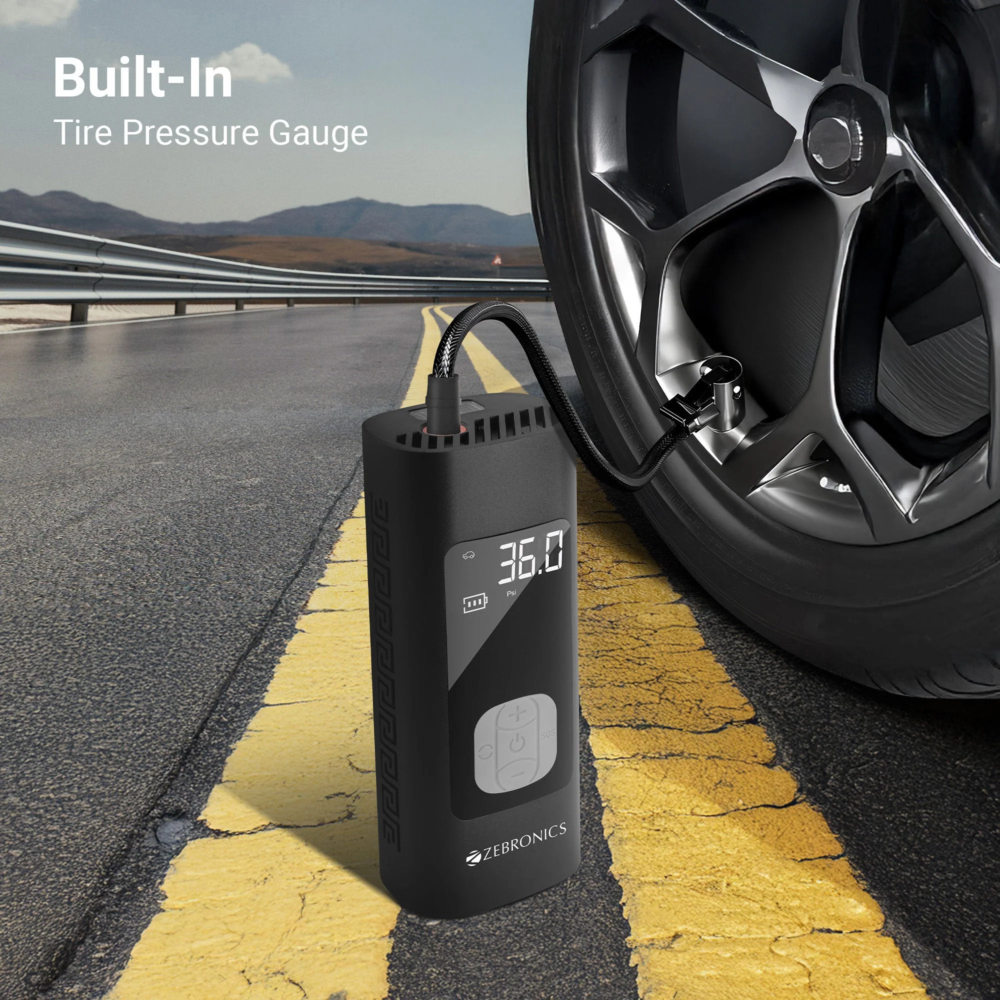 Zebronics ZEB-19TI6 Tire Inflator is a compact and powerful portable air pump designed for inflating car tires, bike tires, bicycle tires and sports balls. Powered by a high-performance motor with 19000 RPM, the inflator delivers fast and efficient inflation with a maximum pressure capacity of 150 PSI.