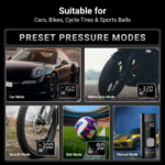 The inflator features 4 preset pressure modes for Car, Bike, Bicycle and Sports Ball. It also supports multiple pressure measurement units including PSI, KPa, Bar and kg/cm², allowing accurate pressure monitoring for different applications.