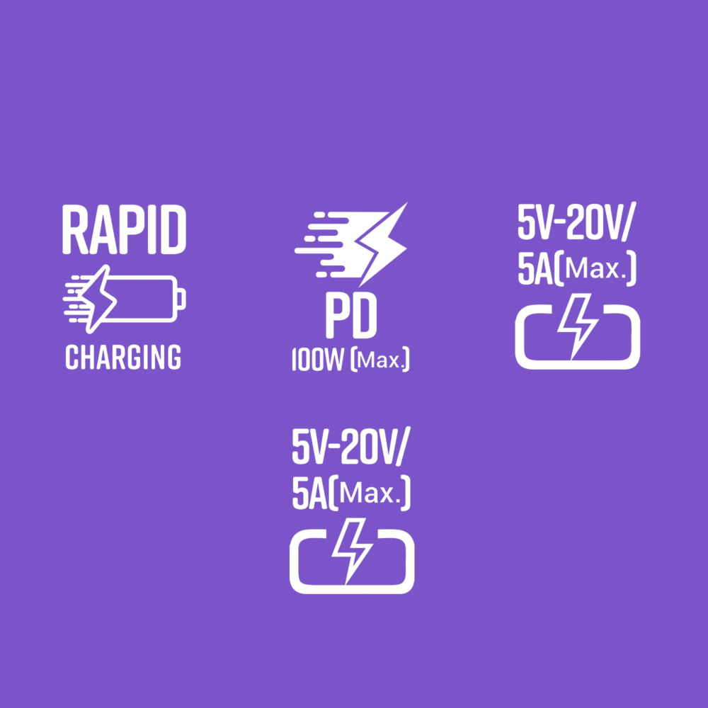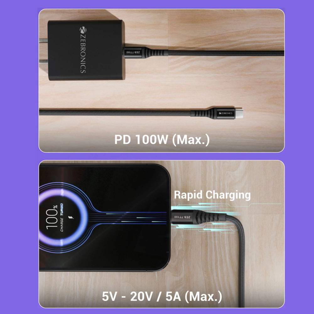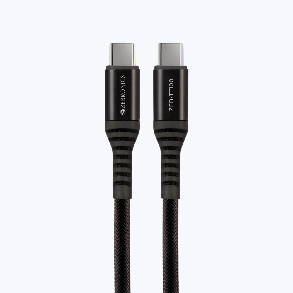 The Zebronics ZEB-DC TT100 Type-C to Type-C Cable is built for high-performance charging and reliable data transfer. Supporting Power Delivery up to 100W with 5A maximum current output, this cable is ideal for charging laptops, smartphones, tablets, and other USB-C compatible devices.