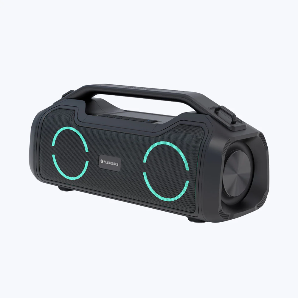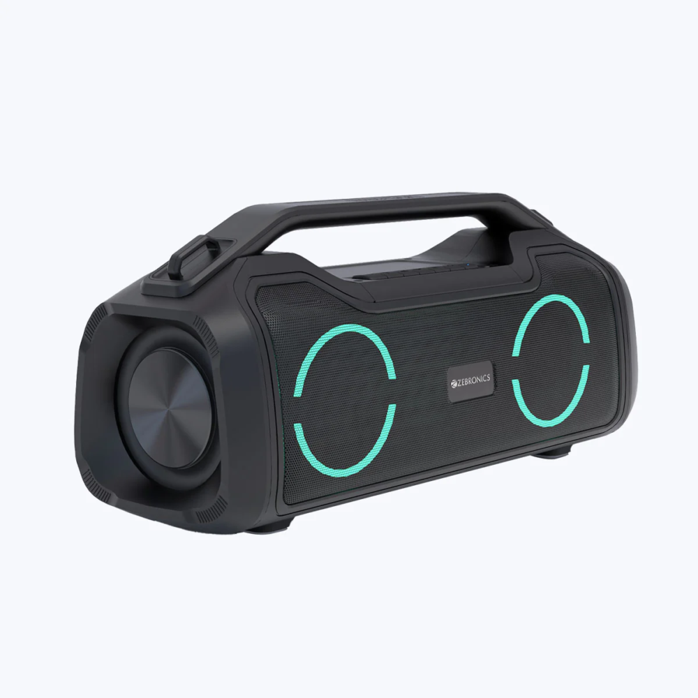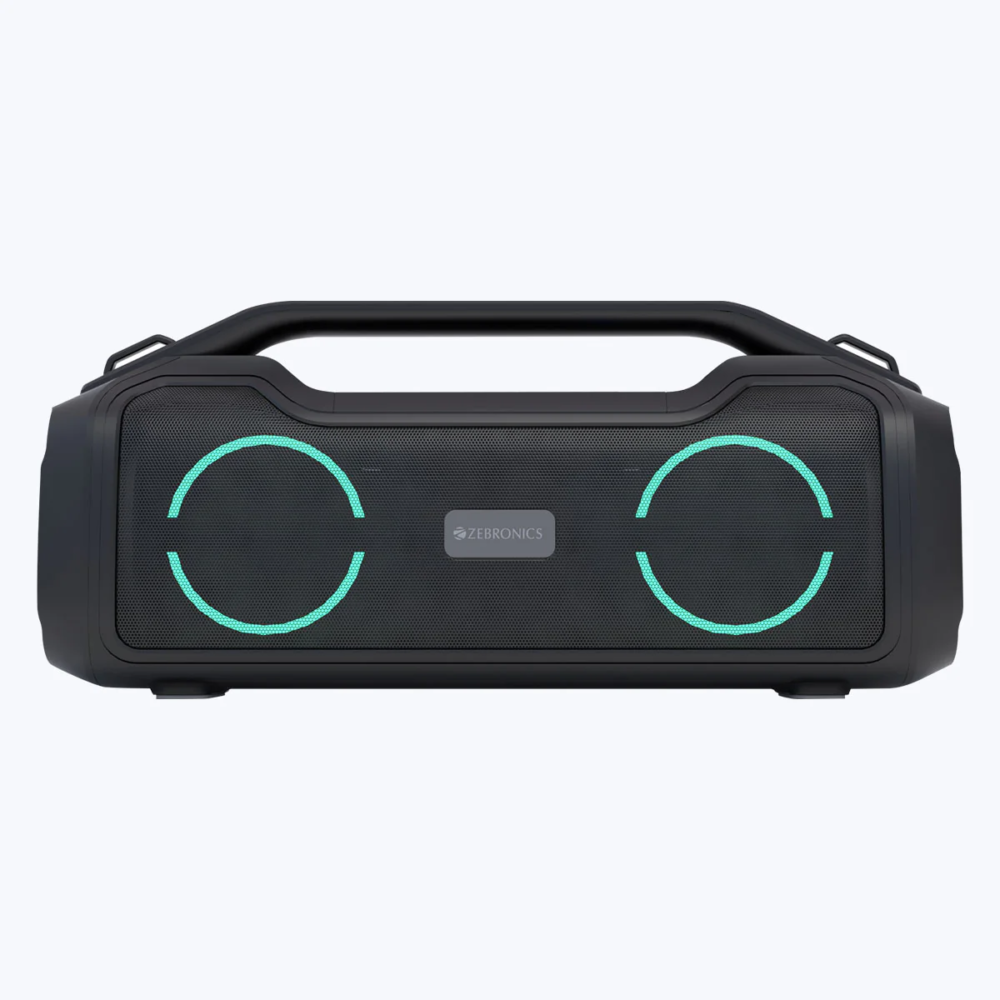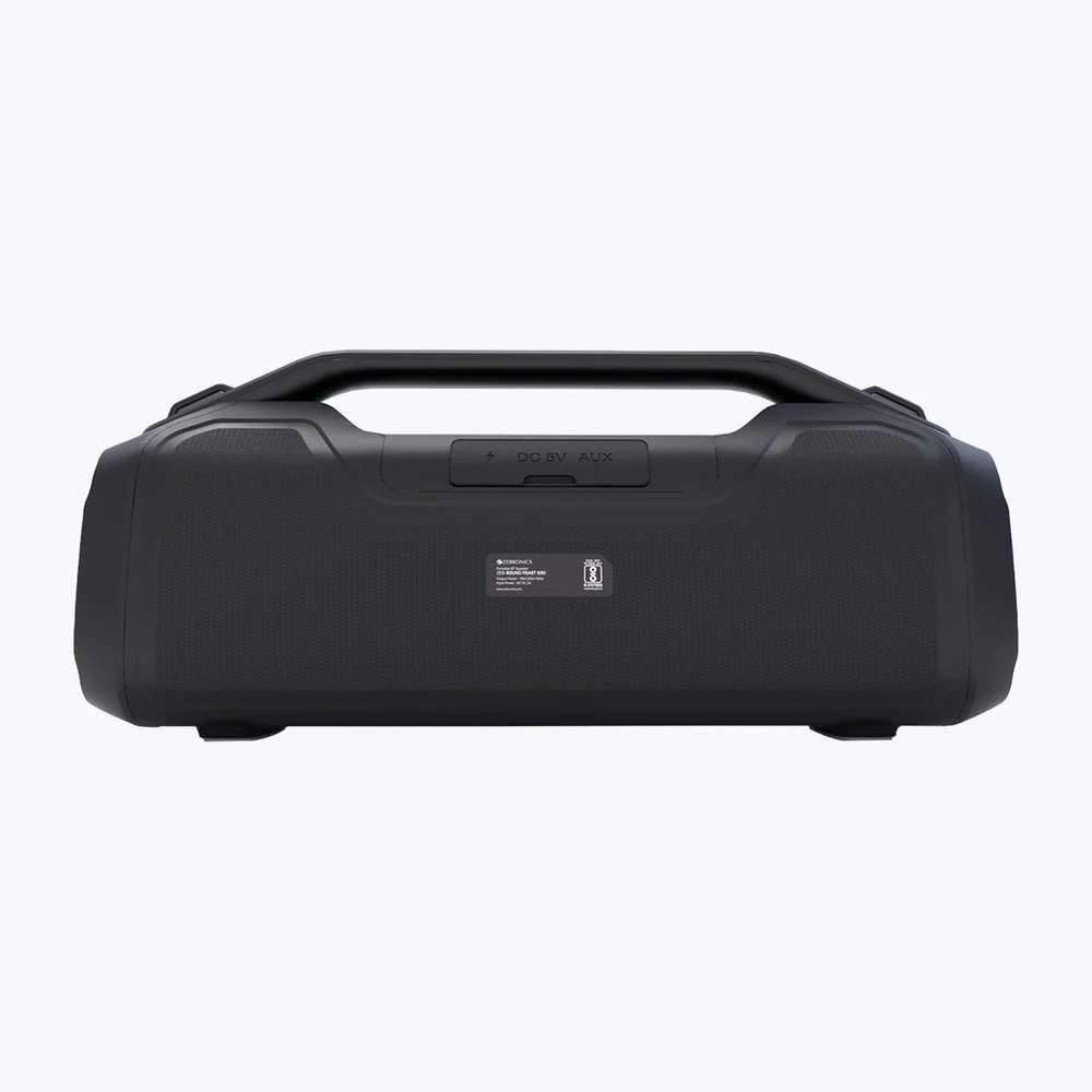 The Zebronics ZEB-Sound Feast 500 is a powerful portable Bluetooth speaker designed in a stylish boombox form factor with vibrant RGB lighting that enhances your music experience. Built for deep bass and immersive sound, the speaker features dual 89mm drivers and dual passive radiators that deliver powerful audio output and thumping bass.